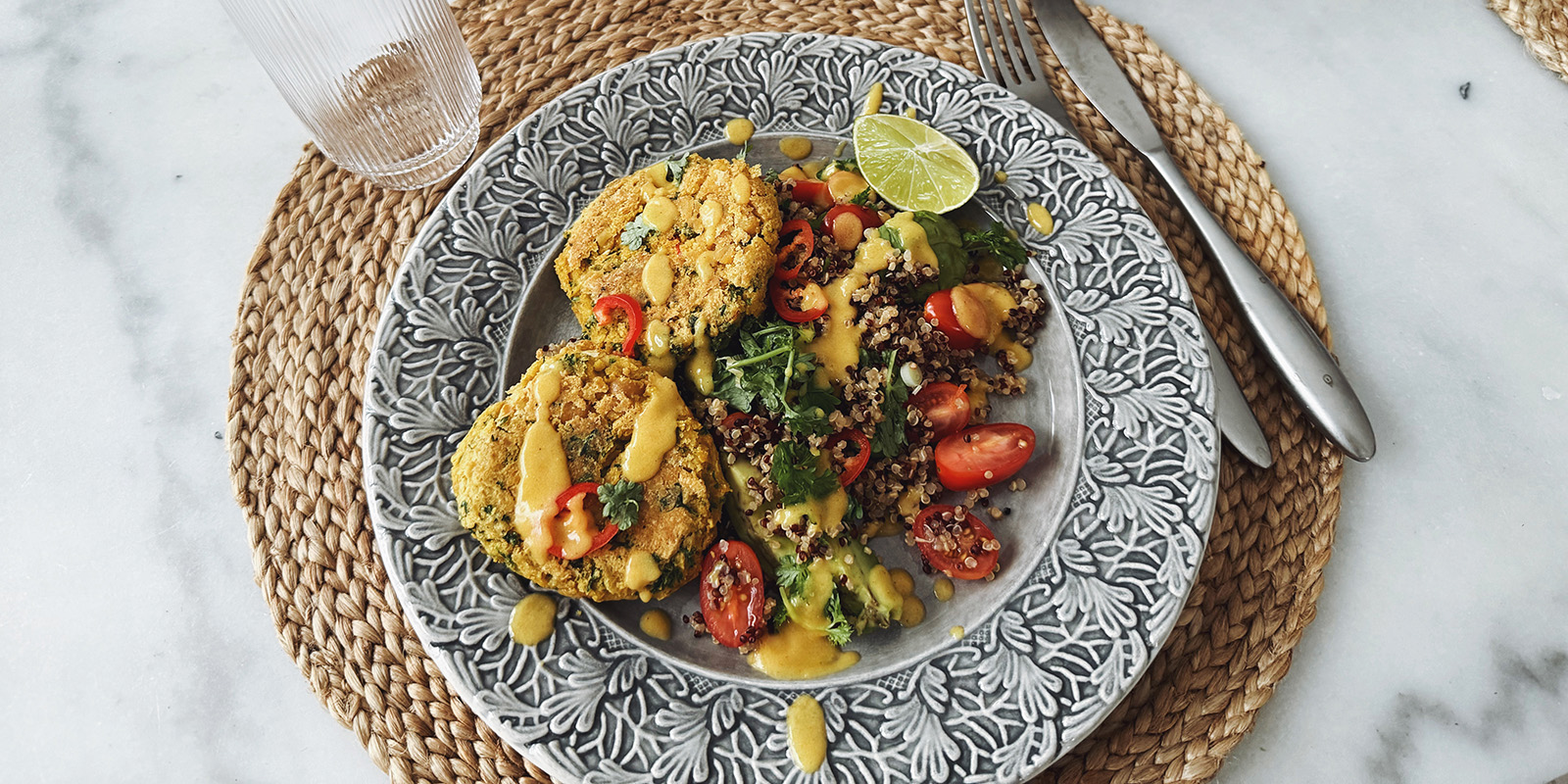 Kikhernepihvit kvinoasalaatin ja currykastikkeen kera